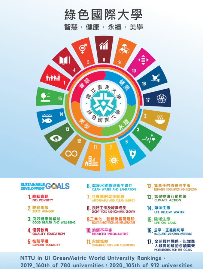 大學作為高等教育人才培育基地,亦擔負著培育未來地球公民的重要使命,對「永續發展」的教育與實踐,更是責無旁貸。1990年在法國塔樂禮市舉行的「大學在環境管理與永續發展的角色」國際研討會中,有20位大學校長與主要領導人共同發起簽署塔樂禮宣言(The Talloires Declaration),並揭示大學永續發展十大行動計畫,包括:(1)對環境永續發展的覺醒;(2)追求永續的校園文化;(3)教育學生成為對環境負責的公民;(4)促進校園每一分子對環境的認知;(5)落實校園生態;(6)結合政府與民間的力量發展;(7)跨域合作;(8)協助中小學並建立夥伴關係;(9)加強國內外周邊合作與服務;以及(10)持續交流與互持。這個宣言後來逐漸發展成今日全球性的「綠色大學」運動;尤其,印尼大學自2010年起辦理UI GreenMetric World University Rankings,至2020年全球已有912所大學參加世界綠色大學評比。本校推動綠色大學以「智慧、健康、永續、美學」為內涵,具體實踐SDGs;期許大學中每一位成員對永續發展的素養與行動,能夠由內而外影響個人、家庭、學校、社會、國家、乃至於全世界未來的生存與生活。